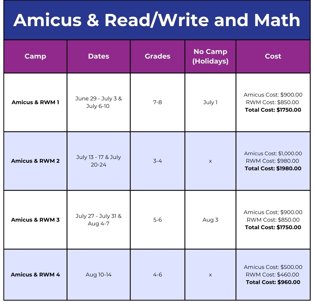 The Amicus Read, Write & Math Camp is a unique partnership between Camp Amicus and the Read/ Write & Math (RWM) department, offering a blend of academic support and summer camp fun. Campers start their day at Amicus Day camp, with large group games, art, sports, and social skill development. In the afternoon, they work one-on-one with a RWM Instructor for two hours, focusing on reading, writing, or math interventions