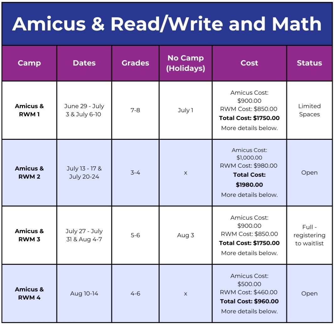Payment for the Read, Write & Math Day Camp must be completed in two transactions: One for the RWM portion and one for the Amicus portion.